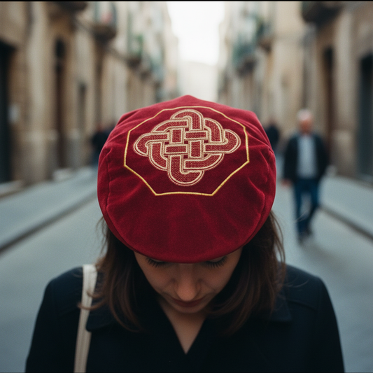 Coppola modello 'Pirandello ' in velluto liscio rosso con Ricamo Acquileia
