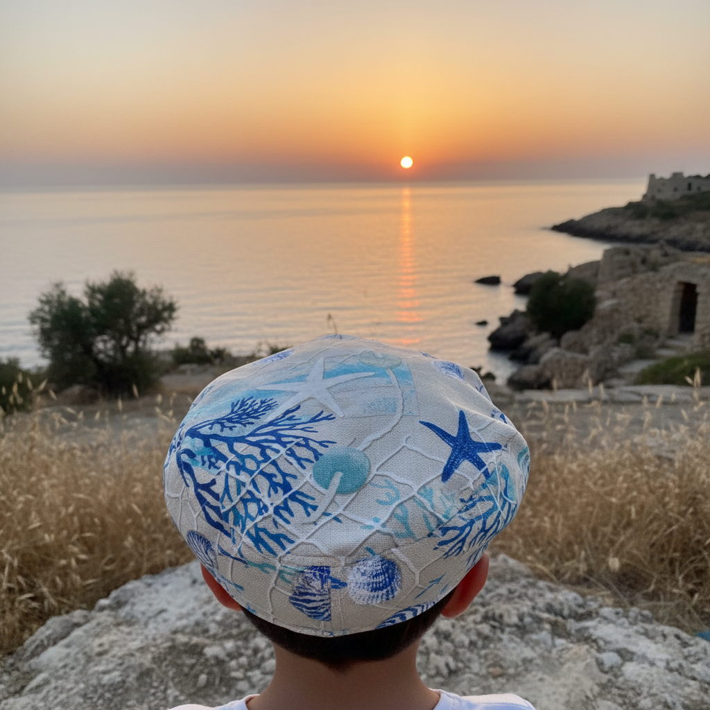 Una coppola siciliana dal fascino mediterraneo, perfetta per bambini e bambine che amano lo stile italiano. Il modello Tim in fantasia corallo combina una base beige raffinata con dettagli blu che richiamano il mare di Sicilia, creando un accessorio elegante e distintivo.